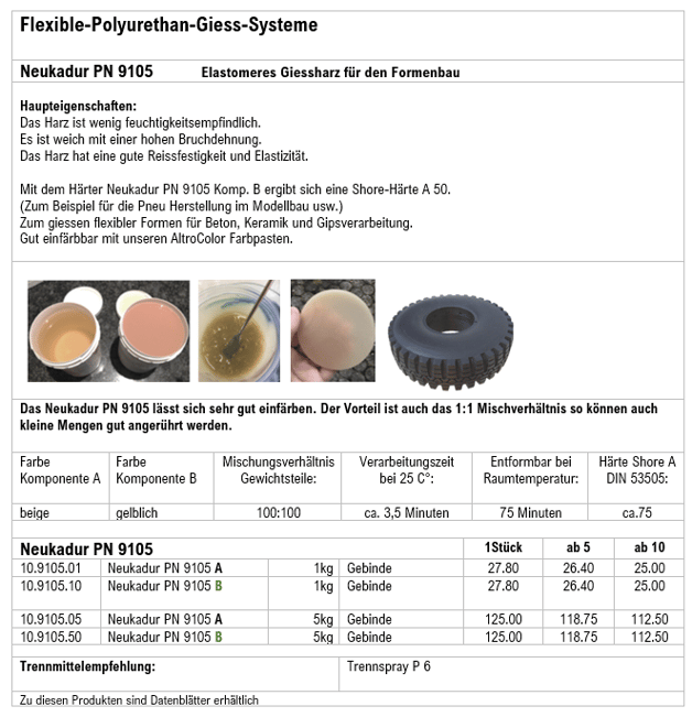 Es ist weich mit einer hohen Bruchdehnung. Das Harz hat eine gute Reissfestigkeit und Elastizität. Mit dem Härter Neukadur PN 9105 Komp. B ergibt sich eine Shore-Härte A 50.