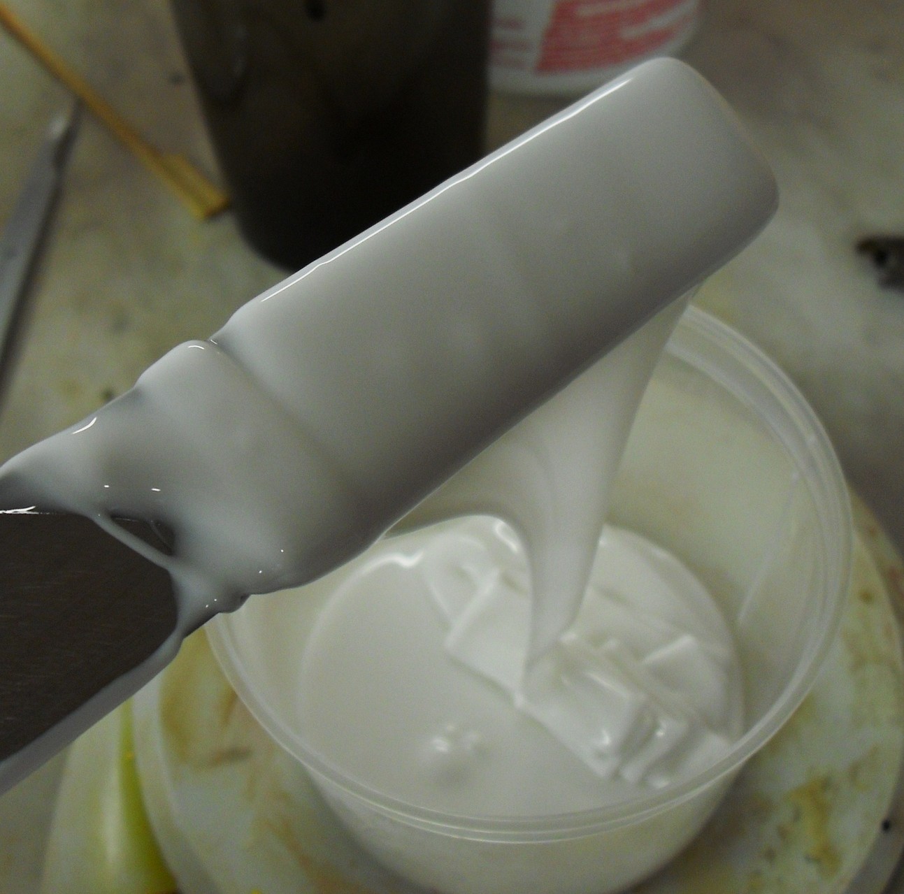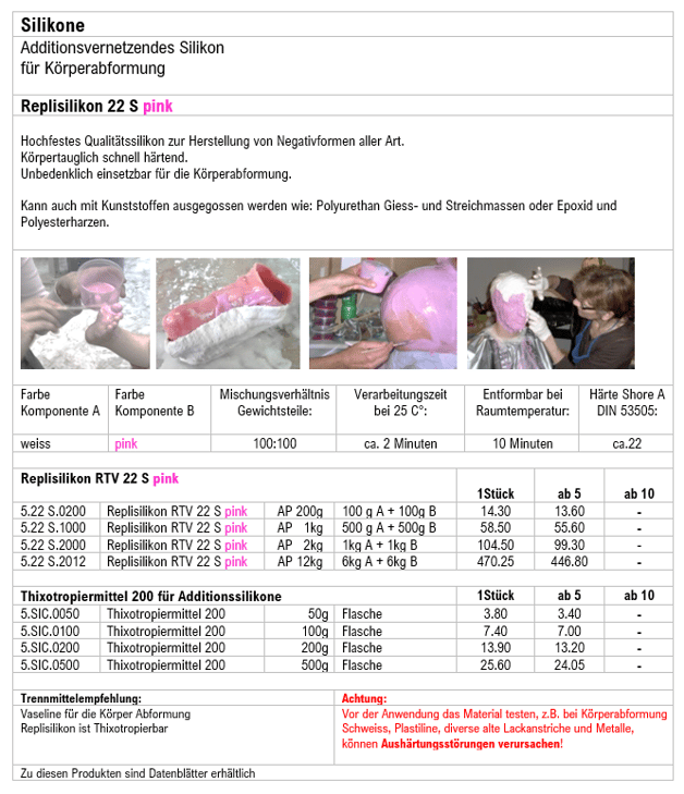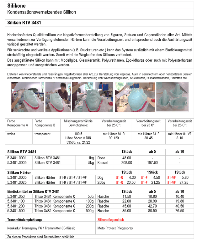 Thixotropiermittel (Komp.C) eingedickt werden, womit ein Weglaufen des Silikons auf dem Objekt verhindert wird. Das ausgehärtete Silikon (nach ca.24 Stunden) kann mit Modellgips, Giesskeramik, Polyurethanen, Epoxidharzen oder auch mit Polyesterharzen