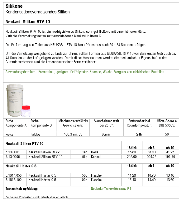 Neukasil Silikon RTV 10 ist ein niedrigviskoses Silikon, sehr gut fließend mit einer höheren Härte.